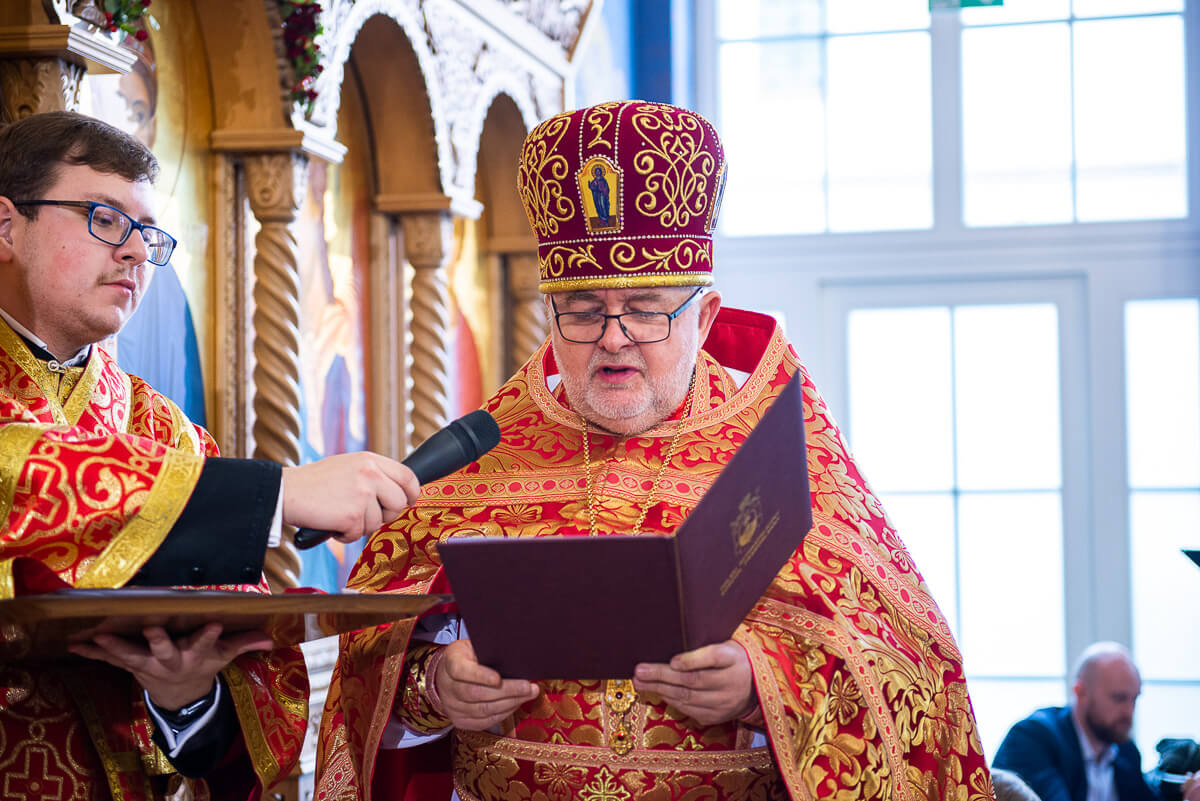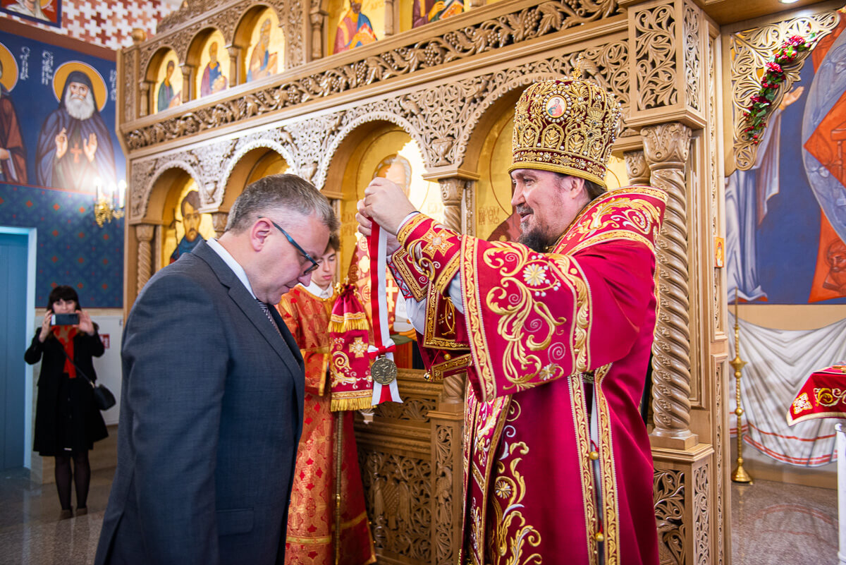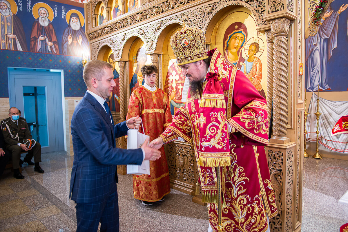U progu świątyni hierarchę powitała delegacja wiernych prosząca władykę o modlitwę za wszystkich zgromadzonych oraz o arcypasterskie błogosławieństwo. Następnie według zwyczajowego porządku p.o. proboszcza ks. por. Rafał Pagór przywitał biskupa oraz poprosił o przewodniczenie Boskiej Liturgii. Wśród zgromadzonych gości byli obecni: gen. dyw. pil. Anatol Czaban, płk Marek Adamowicz, Pan Dominik Zaremba, Pan Maciej Więckowski – prezes zarządu spółki AMW SINEVIA, Pan Marek Jassak – wiceprezes, Pan Krzysztof Stankiewicz, Pan Dariusz Bartosiński, płk Paweł Adam Lachowski – dowódca Garnizonu Białystok będący jednocześnie dowódcą 18. Białostockiego Pułku Rozpoznawczego, płk SG Stanisław Supiński – Zastępca Komendanta Podlaskiego Oddziału Straży Granicznej, płk Sławomir Kocanowski – dowódca 1. Podlaskiej Brygady Obrony Terytorialnej, kpt. Jakub Prokopiuk – reprezentujący Komendanta 25. Wojskowego Oddziału Gospodarczego, st. bryg. Robert Dzierżek – zastępca Wojewódzkiego Komendanta Państwowej Straży Pożarnej, nadkom. Jarosław Antoniuk – zastępca naczelnika Podlaskiego Urzędu Celno–Skrabowego, ks. mjr Tomasz Wigłasz – kapelan ewangelicki.